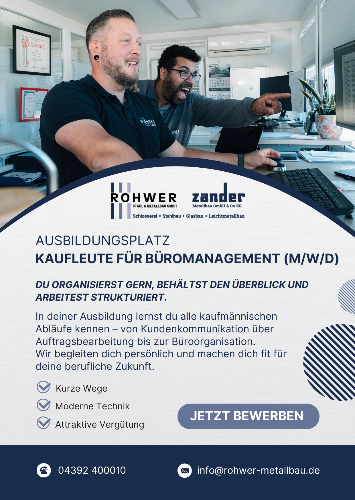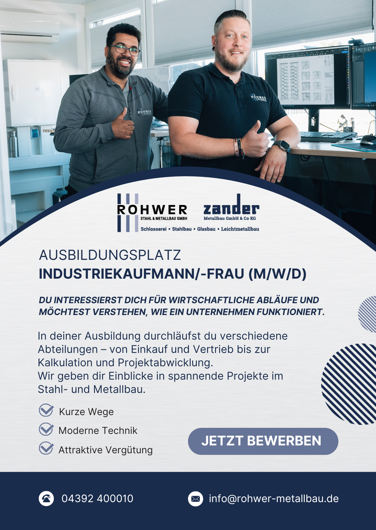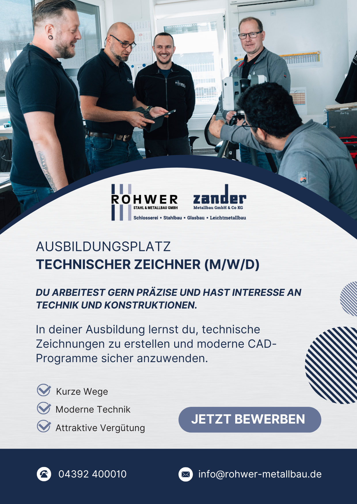 Wir freuen uns auf Deine Bewerbung. Schick uns dieser gerne via eMail an info@rohwer-metallbau.de, du kannst auch gerne direkt unser Bewerbungsformular nutzen